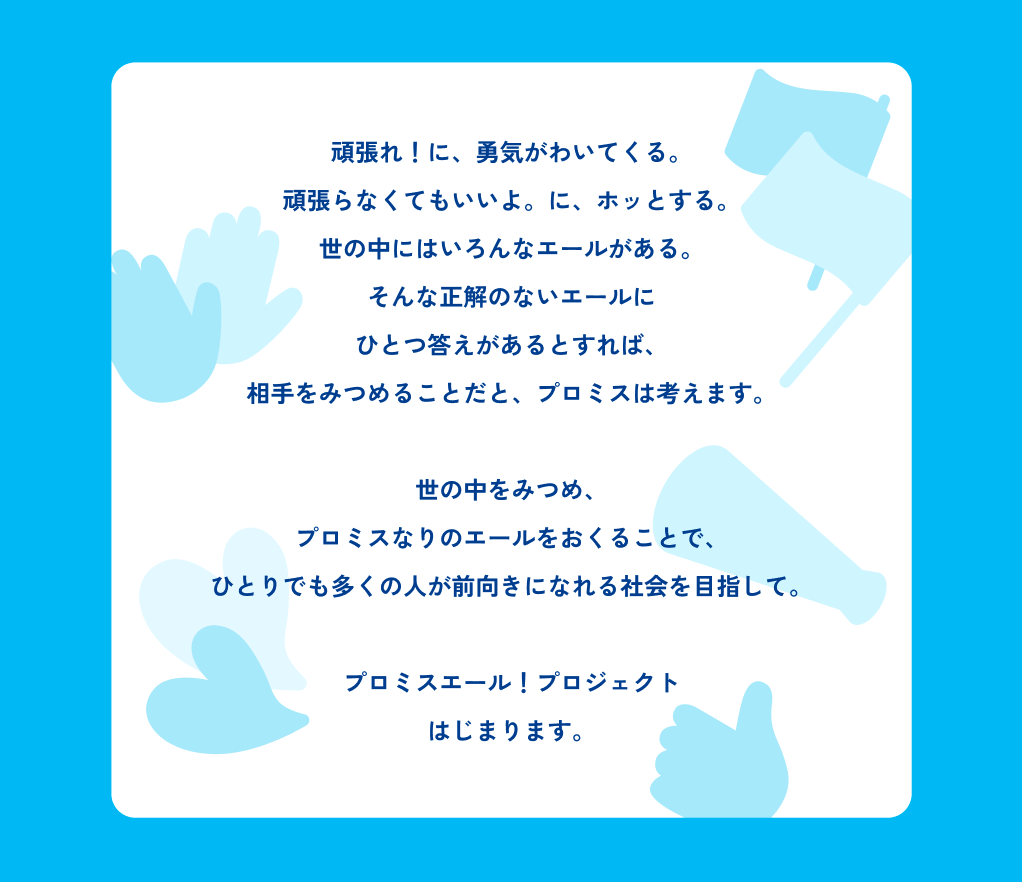 世の中をみつめ、プロミスなりのエールをおくることで、ひとりでも多くの人が前向きになれる社会を目指す本プロジェクト。